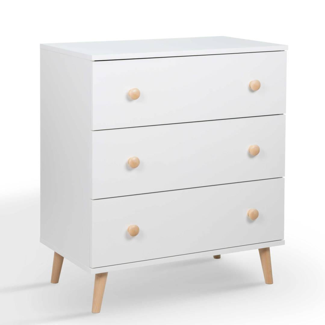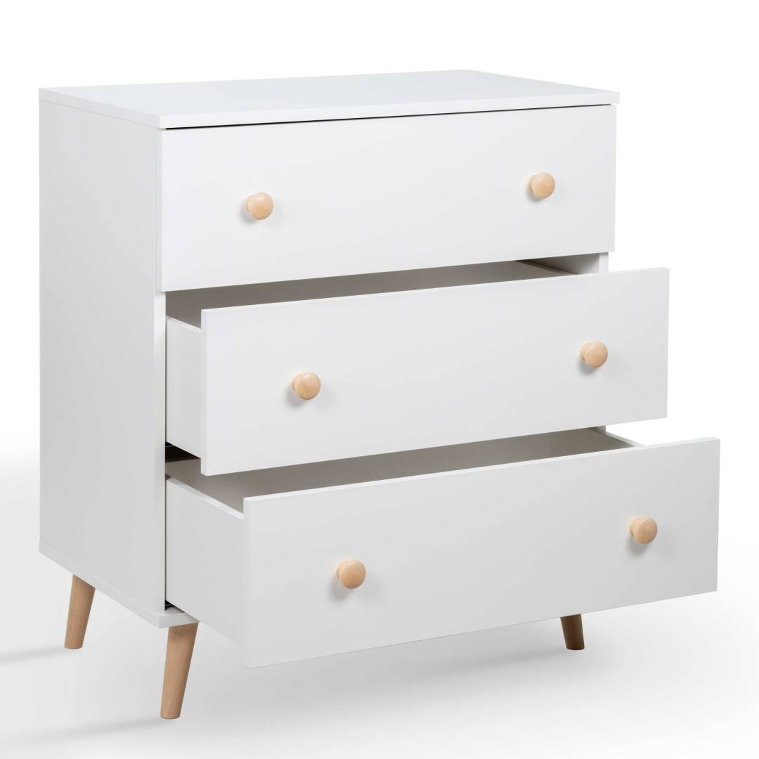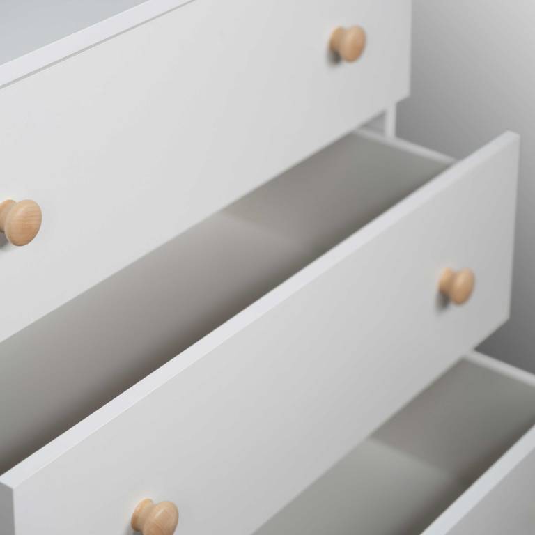 Dzięki solidnej konstrukcji i trzem pojemnym szufladom, Komoda Junama oferuje mnóstwo miejsca do przechowywania dziecięcych ubranek, pieluszek, ręczniczków i wszystkich codziennych akcesoriów. Wszystko, co najważniejsze, znajdzie się w zasięgu ręki, a pokój Twojego dziecka zawsze pozostanie uporządkowany.