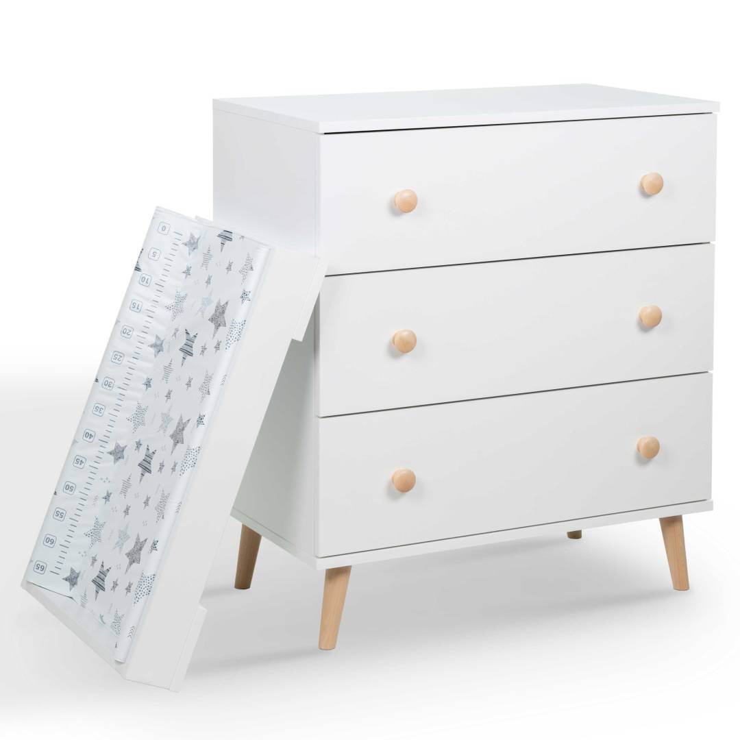 • Praktyczny przewijak w zestawie – komoda może pełnić funkcję przewijaka (nakładka montowana jest dowolnie na blacie), co czyni ją niezwykle funkcjonalnym centrum pielęgnacyjnym dla noworodka.