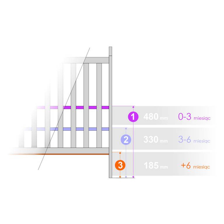 3 wyjmowane szczebelki – ułatwiają starszym dzieciom samodzielne wchodzenie i wychodzenie z łóżeczka.