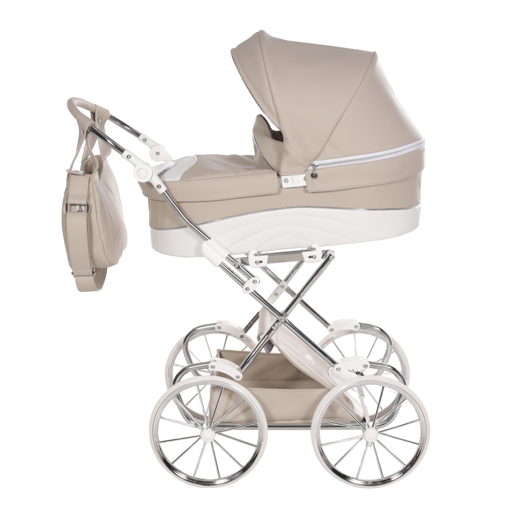 Tapicerka wykonana z trwałego, łatwego do czyszczenia materiału. Duża, klasyczna gondola zapewnia wygodne miejsce dla lalek i maskotek. Składana budka skutecznie chroni „pasażera” przed słońcem, wiatrem i deszczem, a chromowany stelaż dodaje całości wyjątkowej elegancji.
