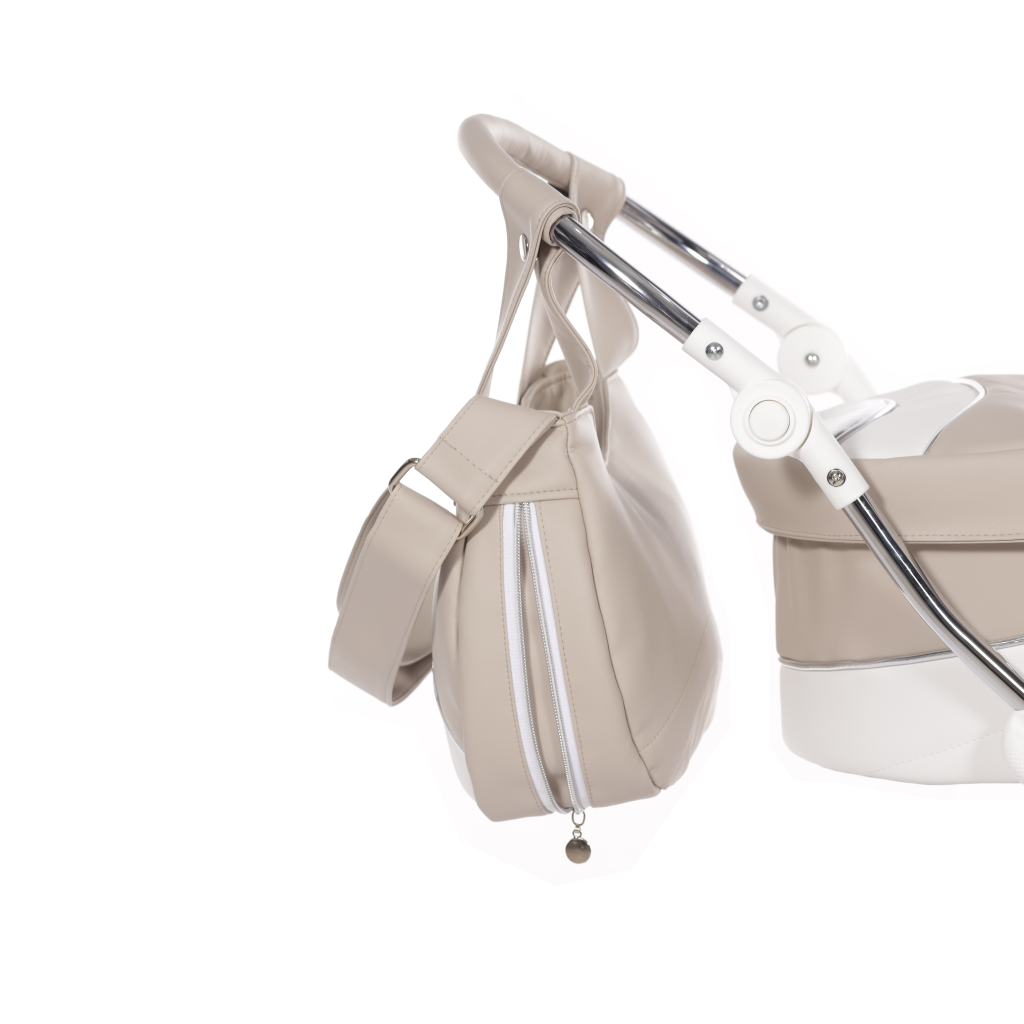 Stabilna konstrukcja na dużych, stylowych kołach gwarantuje płynną jazdę nawet na nierównych powierzchniach. Pod gondolą znajduje się praktyczny kosz na akcesoria, a do zestawu dołączona jest dopasowana torba na drobiazgi. Regulowana rączka umożliwia dopasowanie wysokości do wzrostu dziecka, co znacząco podnosi komfort użytkowania.