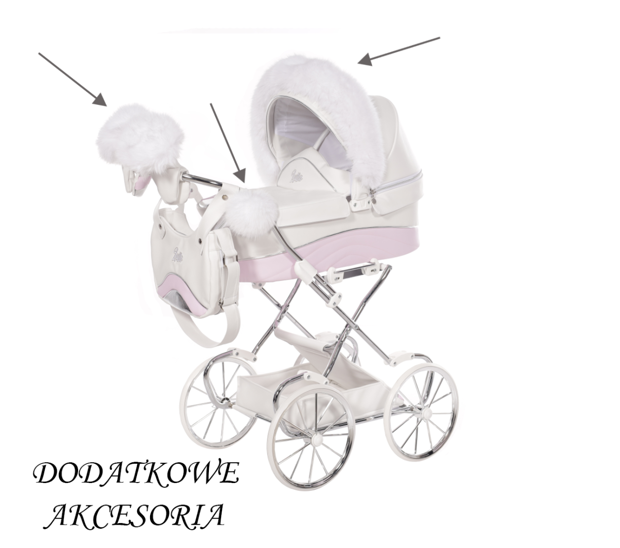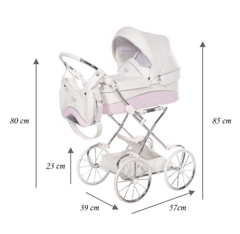 Tapicerka wykonana z trwałego, łatwego do czyszczenia materiału. Duża, klasyczna gondola zapewnia wygodne miejsce dla lalek i maskotek. Składana budka skutecznie chroni „pasażera” przed słońcem, wiatrem i deszczem, a chromowany stelaż dodaje całości wyjątkowej elegancji.