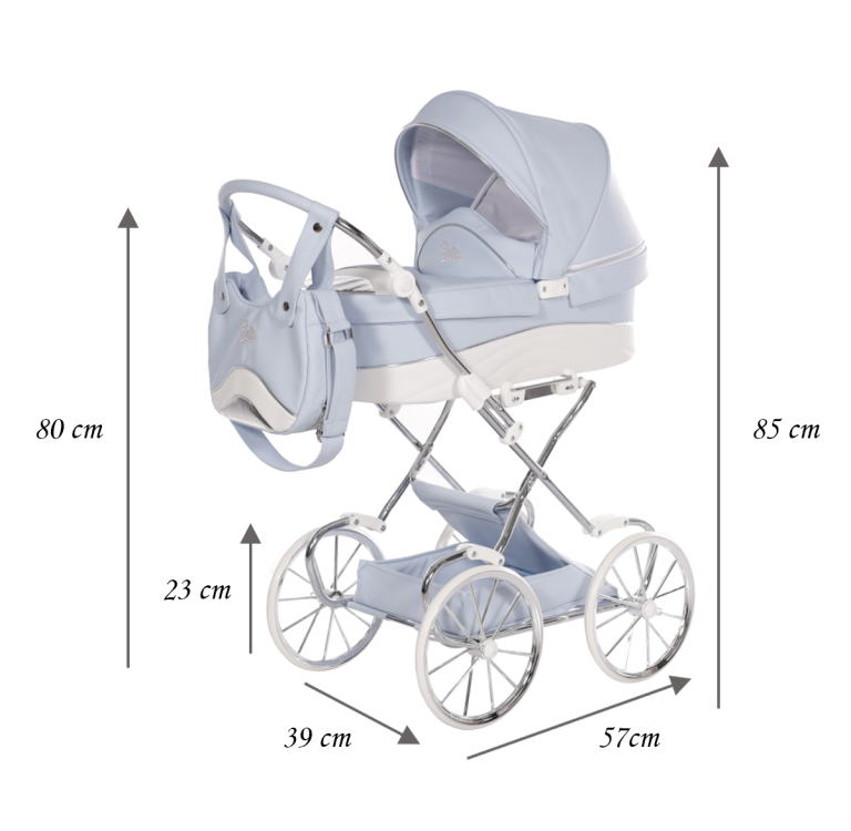 Tapicerka wykonana z trwałego, łatwego do czyszczenia materiału. Duża, klasyczna gondola zapewnia wygodne miejsce dla lalek i maskotek. Składana budka skutecznie chroni „pasażera” przed słońcem, wiatrem i deszczem, a chromowany stelaż dodaje całości wyjątkowej elegancji.